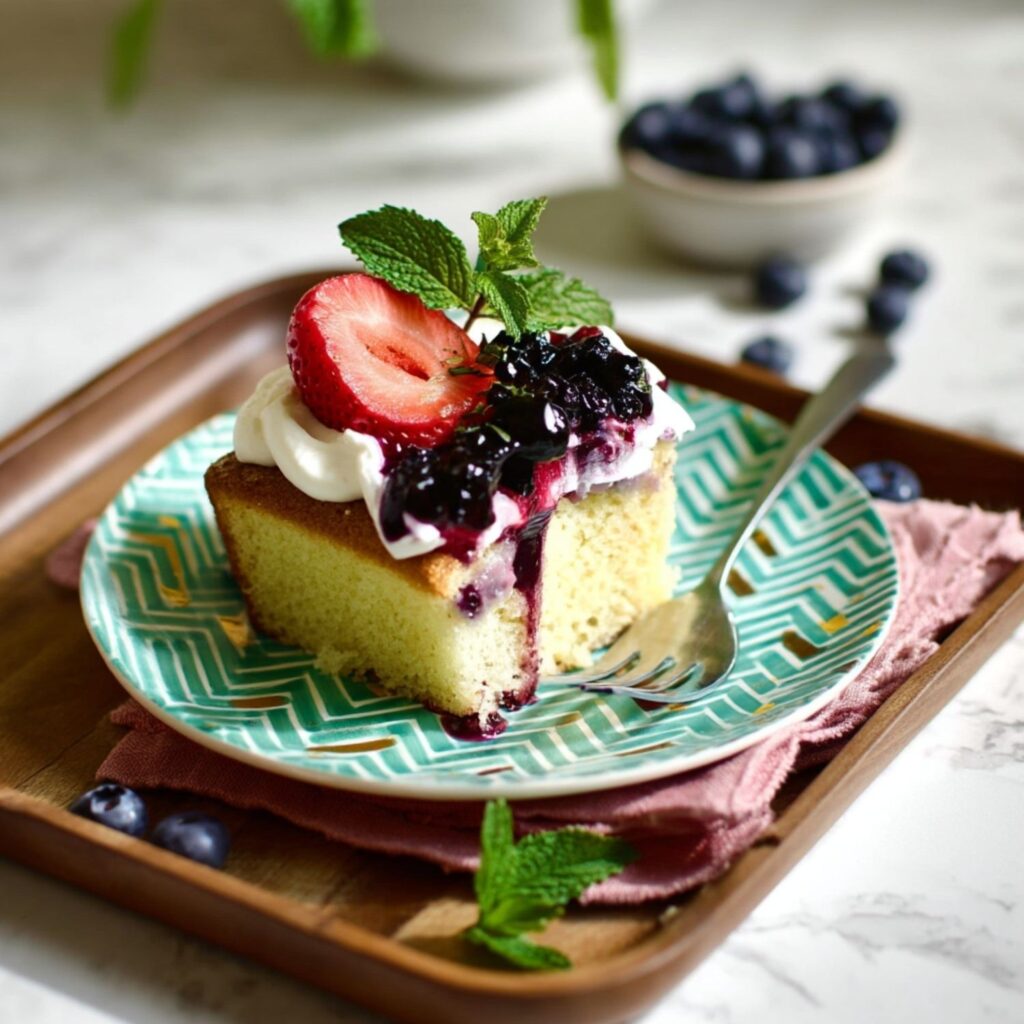 Think fruit tres leches cake meets red, white, and blue dessert, with whipped cream doing heroic work. Very patriotic. Very low-stress.