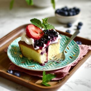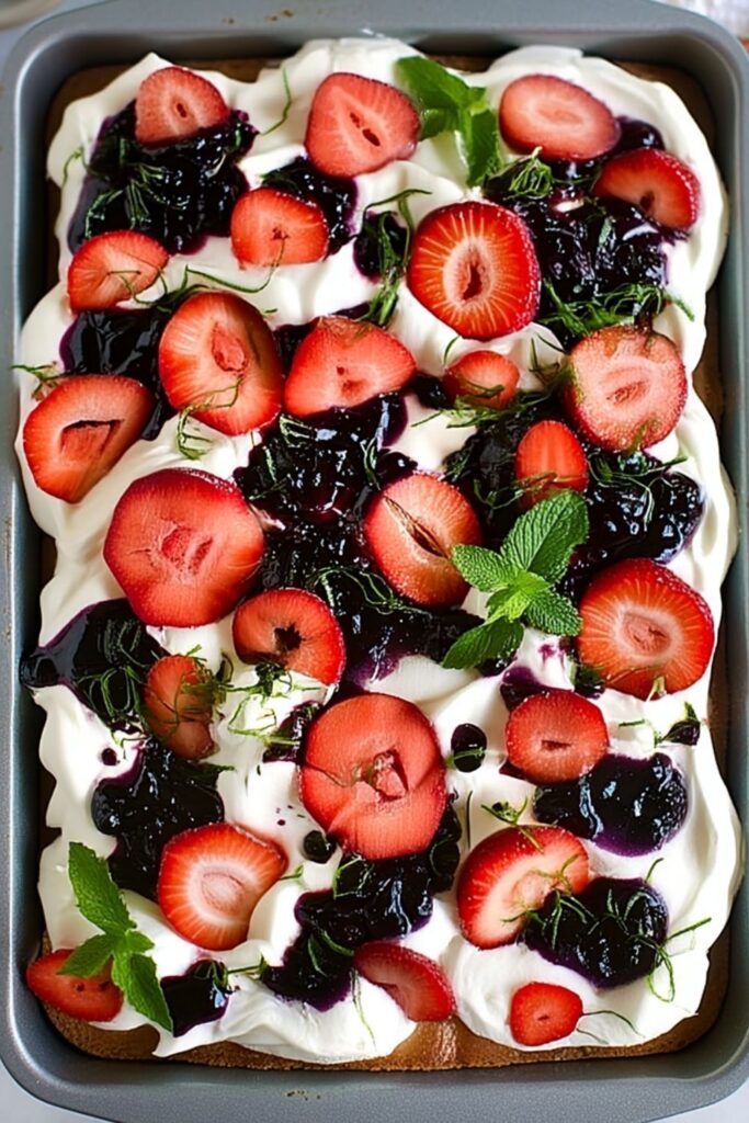 - Top the Cake: Spread the whipped cream over the chilled cake. Spoon the cooled blueberry jam over the whipped cream, then add sliced strawberries and mint if using.2 cups sliced fresh strawberries, Fresh mint leaves