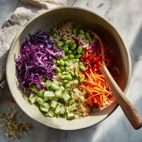 - Combine Vegetables: Transfer the slightly cooled quinoa to a large bowl. Add the red cabbage, edamame, bell pepper, carrots, and cucumber, and gently toss to mix.1 cup chopped red cabbage, 1 cup cooked shelled edamame, 1 red bell pepper chopped, 1/2 cup shredded carrots, 1 cup diced cucumber