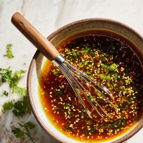 - Make Dressing: In a small bowl, whisk together the soy sauce or tamari, sesame oil, rice vinegar, green onion, cilantro, sesame seeds, ginger, and red pepper flakes. Taste the dressing and adjust the seasoning with salt and black pepper if needed.1/4 cup low-sodium soy sauce or tamari, 1 tablespoon sesame oil, 1 tablespoon rice vinegar, 2 tablespoons chopped green onion, 1/4 cup chopped cilantro, 1 tablespoon sesame seeds, 1/4 teaspoon grated fresh ginger, 1/8 teaspoon red pepper flakes, Salt and black pepper to taste