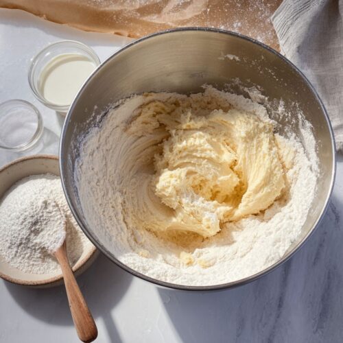 - Combine Dry Ingredients: In a separate bowl, whisk together flour, baking powder, and salt. Gradually add this dry mix to the butter mixture on low speed until a soft dough forms. If it’s too sticky, mix in a little extra flour; if it’s too stiff, add a teaspoon of milk.2¼ cups all-purpose flour, ½ teaspoon baking powder, Pinch of salt