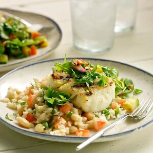 - Plate and Serve: Spoon the rice-and-bean mixture onto plates, top with a fish fillet, and finish with a generous scoop of the vegetable relish. Serve right away for the best contrast between warm fish and crisp relish.
