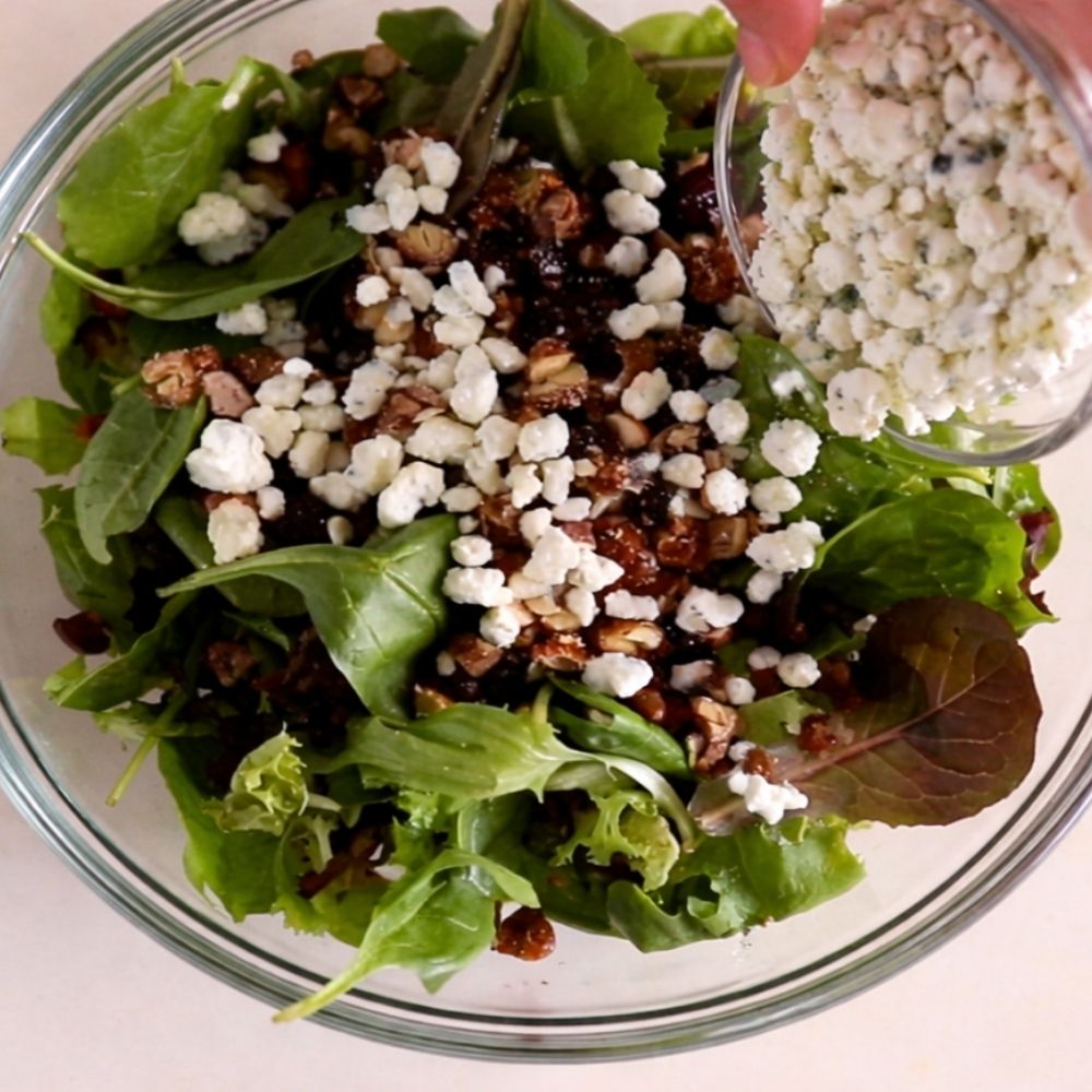 - Build the Salad: Add the mixed greens to a large bowl. Sprinkle in the dried cranberries and cinnamon-toasted almonds, then add the crumbled blue cheese.
