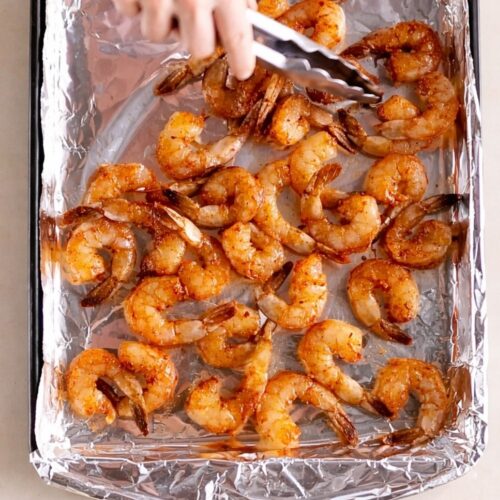 - Roast the Shrimp: Spread the shrimp in a single layer on the prepared baking sheet. Bake for 6–8 minutes, until pink and cooked through. Remove from the oven and keep warm while you prep the rest.
