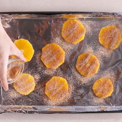 - Warm the Oranges: Sprinkle the orange slices with cinnamon sugar. Bake at 425°F for 4–6 minutes, just until warmed and glossy-looking, then remove from the oven.