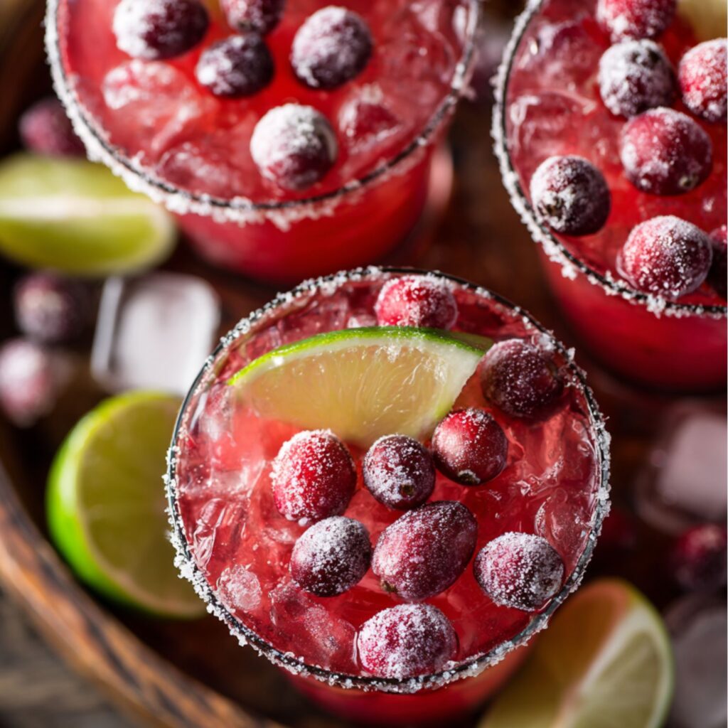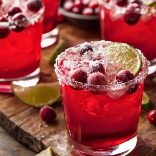 - Serve the Margaritas: Fill each glass with crushed ice or ice cubes. Pour the chilled margarita mixture into the glasses. Garnish with lime slices and, if desired, a few sugared cranberries for that extra holiday sparkle.