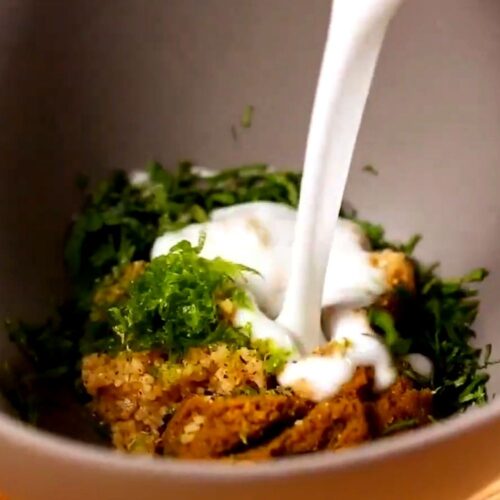 - Make Curry Sauce: In a second bowl, whisk together the green curry paste, minced garlic, remaining 2 tablespoons chopped cilantro, lime zest, coconut milk, remaining ½ teaspoon salt, and remaining ¼ teaspoon black pepper until smooth.