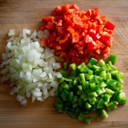 - Chop the Veggies: Dice the onion, red bell pepper, and green bell pepper while the beef is cooking.½ cup diced onion, 1 red bell pepper, 1 green bell pepper
