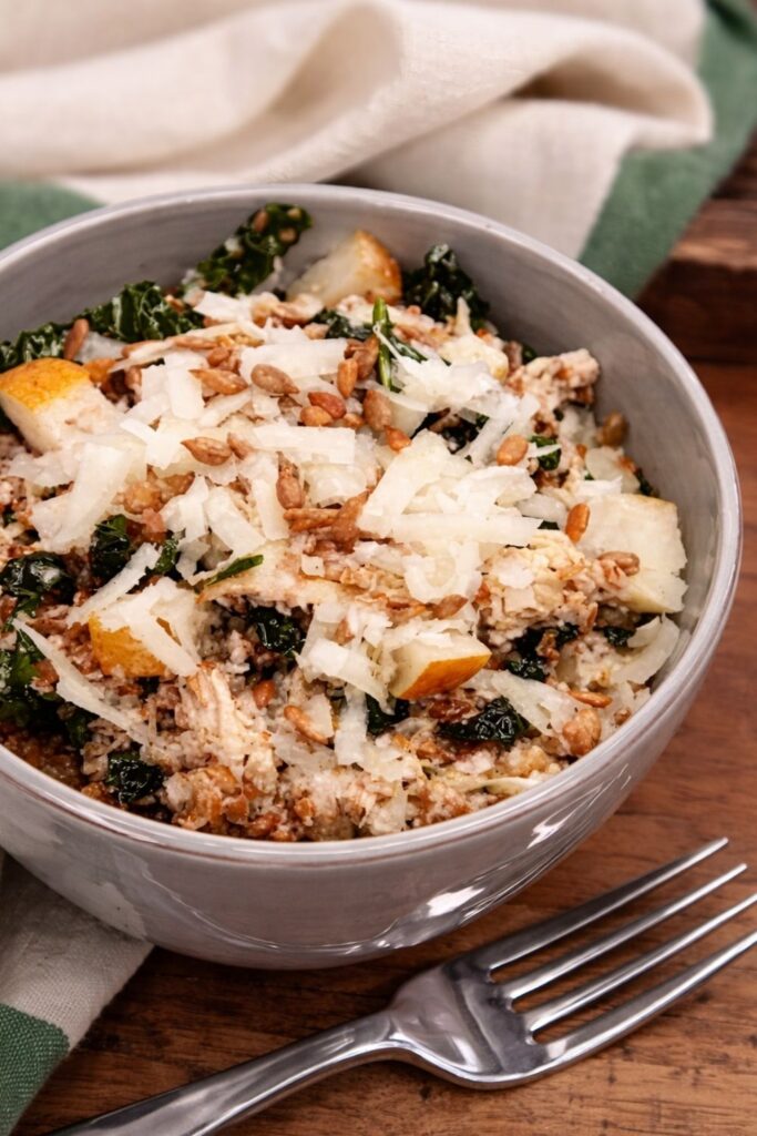 The soaked bulgur gets creamy, the kale stays sturdy, and the pear brings that sweet crunch that makes everything feel a little smarter than it really is, because it’s annoyingly well balanced.