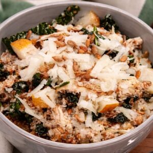 - Toss the Bowl: Toss everything together with tongs or a large spoon for 1 to 2 minutes, until the kale, bulgur, chicken, pear, and cheese are evenly combined and coated in the dressing.