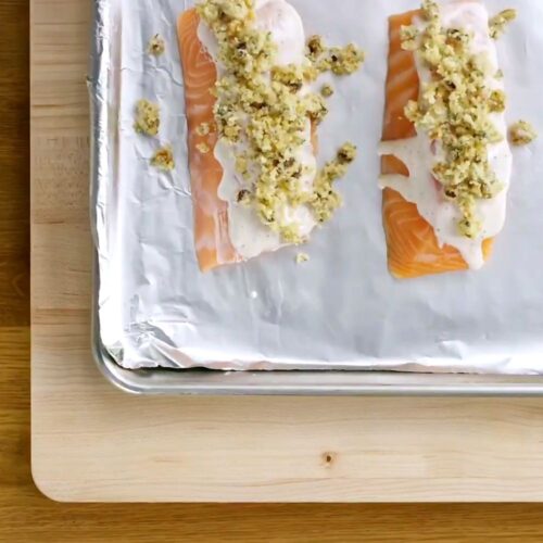 - Add the Walnut Crust: Press the walnut and panko mixture onto the mayonnaise-coated tops of the salmon fillets so it forms a thick, even crust.