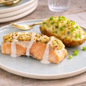 - Serve: Remove the salmon and potatoes from the oven. Let them cool slightly, then serve the crunchy walnut salmon alongside the twice-baked colcannon potatoes.