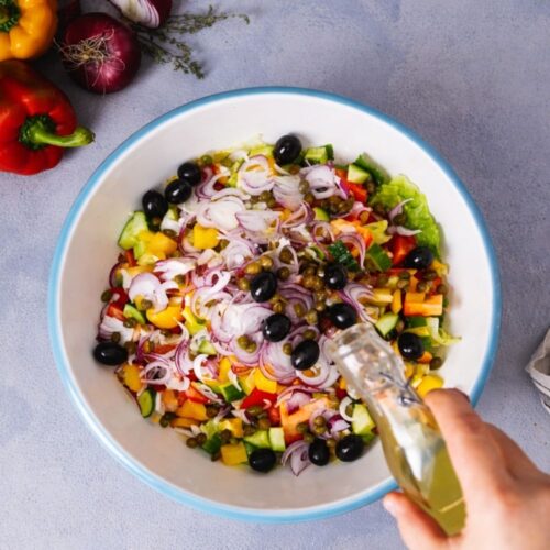 - Dress Salad: Drizzle the olive oil evenly over all the ingredients.