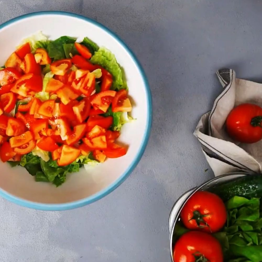 - Add Vegetables: Add the chopped tomatoes, bell pepper, and cucumber evenly over the lettuce.