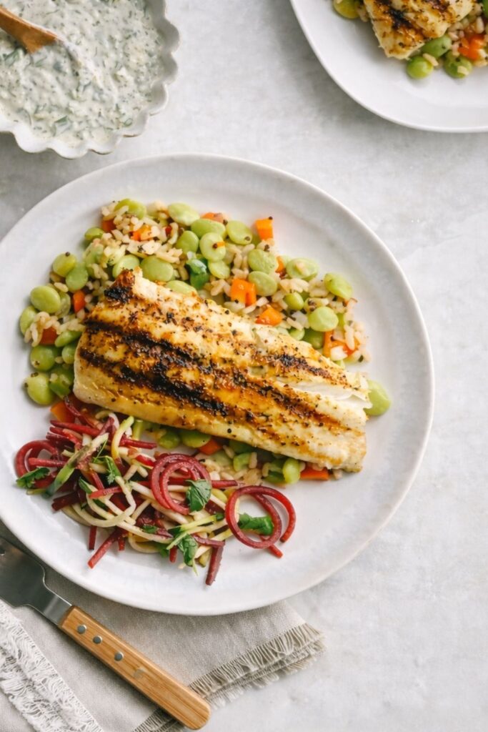 It turns out grilled fish plus a punchy lemon dressing and those colorful tangled veggies is the kind of combo that makes you feel like you’ve got your life together, even if you absolutely don’t—it’s basically edible self-improvement.