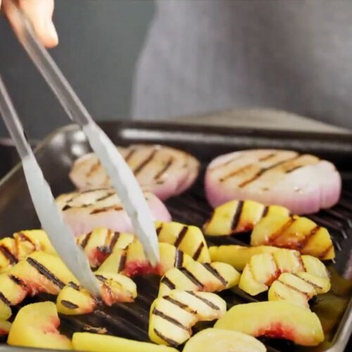- Grill Fruits and Onion: Heat a grill pan over medium-high heat. Grill the peach wedges and onion rounds for 3 to 5 minutes per side until lightly charred and softened.