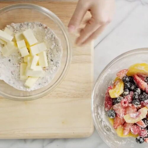 - Prepare Cobbler Fruit: In a baking dish, combine the mixed berries and sliced peaches. Sprinkle about 2 tablespoons of the sugar evenly over the fruit.