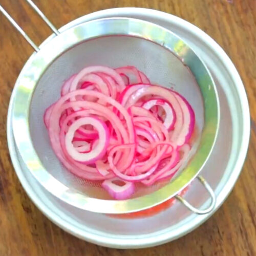 - Drain and Reserve Liquid: Strain the onions and set them aside, reserving about 2 teaspoons of the pickling liquid for later use.