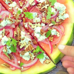 - Add Toppings: Remove the watermelon from the grill and transfer to a cutting board. Evenly top with pickled onions, crumbled blue cheese, and chopped pecans. Sprinkle fresh herbs over the top for a bright, fresh flavor.