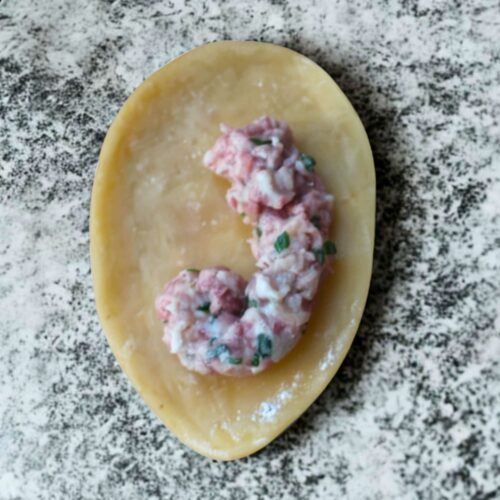- Shape the Ears: Top the filled oval with another egg-washed oval, pressing gently to seal and remove any air bubbles. Pinch and slightly pull about one-third up from the bottom to form the inner ear (the tragus). Brush a bit more egg white around the outer edge, then roll and fold it slightly to create the curved outer rim (the helix). Pinch the bottom gently to form the lobe. Repeat with remaining dough and filling — mirror some shapes for left and right ears!