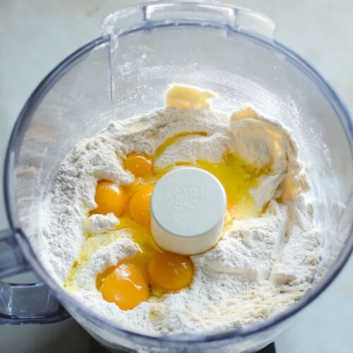 - Make the Dough: In a food processor, combine the flour, whole egg, egg yolks, olive oil, and salt. Blend until the mixture forms small clumps. Turn it out onto a large board (no need to flour it) and knead for about 10 minutes, until smooth and elastic. Shape into a ball, wrap tightly in plastic wrap, flatten slightly into a disc, and let it rest at room temperature for 1 to 2 hours.1 cup all-purpose flour, 1 whole egg, 3 egg yolks, 1 tablespoon olive oil, ¼ teaspoon salt