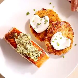 The salmon stays rich and flaky, the herb-garlic butter does all the heavy lifting, and the cheesy potato cakes come in crisp and golden like they know they’re the favorite part, because they kind of are.