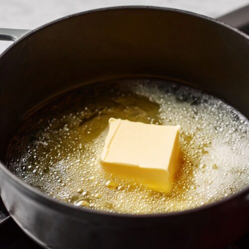- Melt the Butter: Add the butter to a large saucepan or Dutch oven and melt it over medium heat until fully liquid and starting to sizzle.4 tablespoons unsalted butter