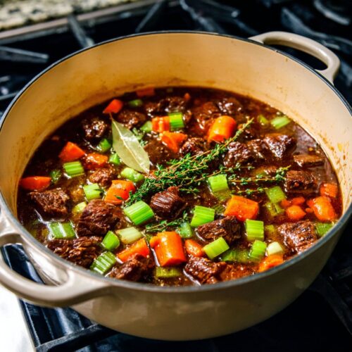 - Brown the Beef: Heat 1 tablespoon of olive oil in a large pot over high heat. Pat the beef dry with paper towels, season with salt and pepper, and sear in batches until well-browned on all sides. Remove and set aside.1 tablespoon olive oil, 1 pound stewing beef, ½ teaspoon salt, ½ teaspoon black pepper
