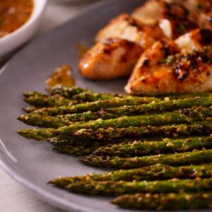 - Serve: Slice the chicken if desired and serve alongside the chargrilled asparagus. Spoon extra glaze over the chicken for maximum flavor.