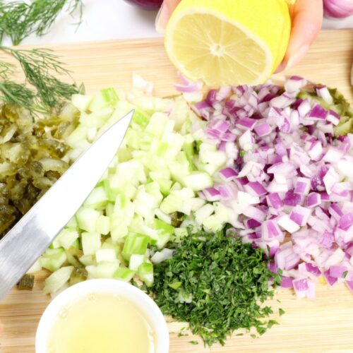 - Prep the Ingredients: Dice the celery and red onion. Mince the pickles. Chop the parsley and dill. Squeeze the lemon for juice.2 tablespoons dill pickles, 2 ribs celery, 1/4 cup red onion, 1 tablespoon fresh parsley, 2 teaspoons fresh dill, 1 tablespoon lemon juice