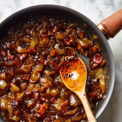 - Slow-Cook the Onions: Add the butter to the bacon fat, then pile in the sliced onions. Drop the heat to medium-low and cook, stirring often, until the onions turn deep golden and super soft, about 45 to 60 minutes. If they’re browning too fast, lower the heat and keep going.3 tablespoons unsalted butter, 4 large yellow onions