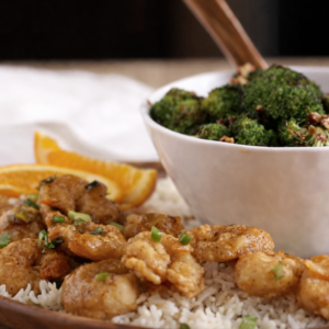 Orange Sriracha Shrimp & Broccoli with Pecan Crunch