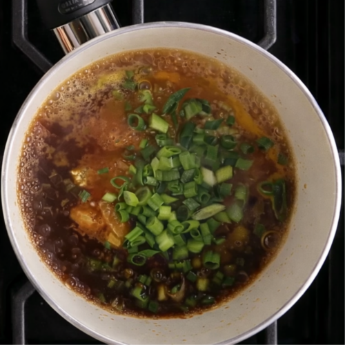 - Simmer and Finish Sauce: Stir in the grated ginger and sliced green onions. Simmer, stirring often, until the sauce looks slightly thicker and glossy, about 2 to 3 minutes.