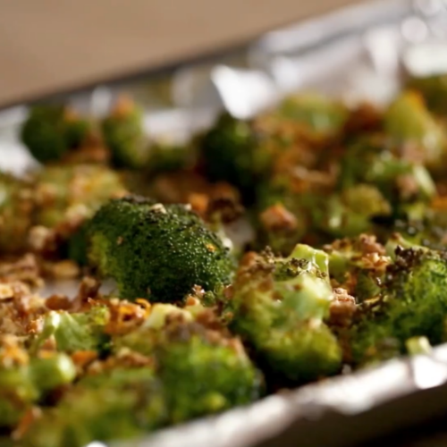 - Top and Toast Broccoli: Sprinkle the pecan crunch over the roasted broccoli. Return it to the oven just to toast the topping, about 3 to 5 minutes.