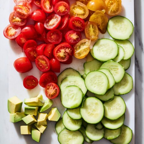 - Prep the Veggies: Slice the cherry tomatoes and cucumbers. Cube the avocado. Slice the onions if you’re using them.2 cups cherry tomatoes, 1 cup sliced cucumbers, 1 small avocado
