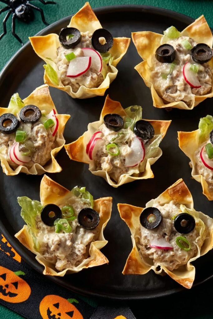 These little monster-faced wonton cups are basically the MVPs of salty snacks for a Halloween party—crispy, cheesy, and just creepy enough to pass as Halloween fingerfood without scaring off picky eaters. They look like edible Halloween adult appetizers, but honestly, everyone’s going to fight over them.