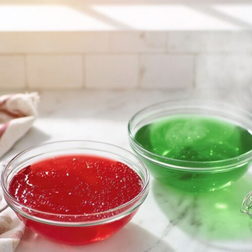 - Add the Jell-O: Using a large spoon, pour the raspberry Jell-O over some of the holes, then the lime Jell-O over the remaining holes. Alternate colors to create a red-and-green pattern. You won’t need to use all the liquid—just enough so the Jell-O seeps into the holes.