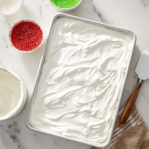 You don’t need steady hands or pastry bags to make this cake sparkle. Grab some Christmas sprinkles or crushed peppermint, throw them with purpose (or chaos), and you’re done. The trick is to look confident while doing it, even if your cake looks like a toddler helped.