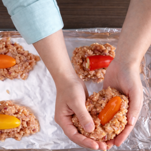 - Shape and Fill the Meatloaves: Divide the turkey mixture into 4 portions on the foil-lined baking sheet. Press one stuffed pepper into the center of each portion and mold the turkey around it to form compact mini meatloaves.