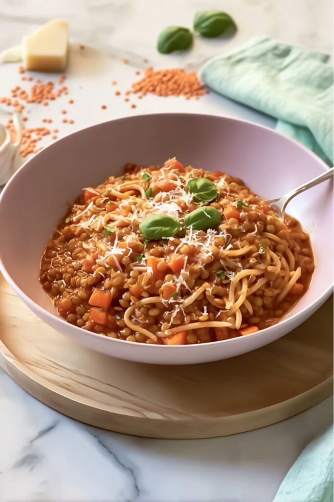 Thick spaghetti, tender lentils, and tomato simmer into serious comfort food. It’s exactly the kind of rustic bowl that earns a spot among Stanley Tucci Recipes—simple ingredients, big flavor, and zero unnecessary drama.
