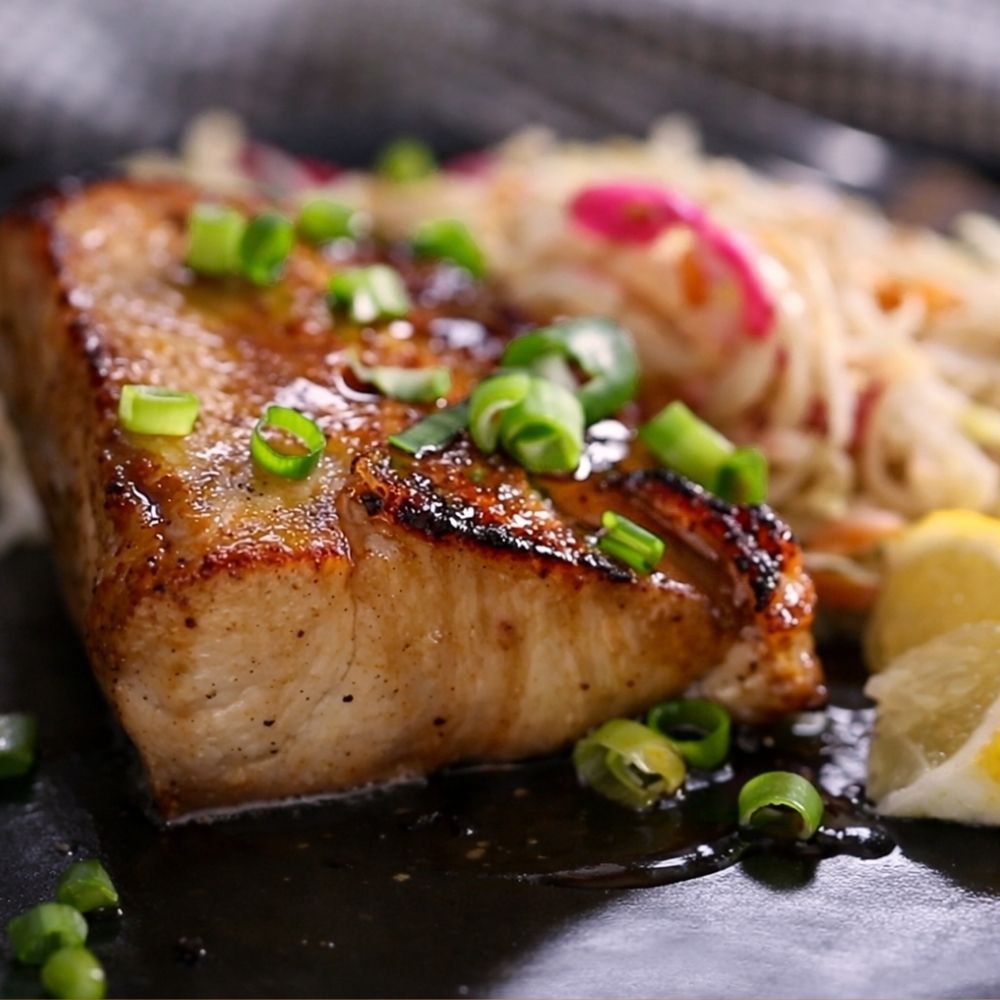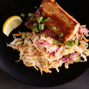 - Brush and Serve: Remove the fish from the oven and brush with the reserved glaze for extra shine and flavor. Serve the fish over the sesame cashew slaw, top with sliced green onions, and squeeze lemon over everything right before eating.