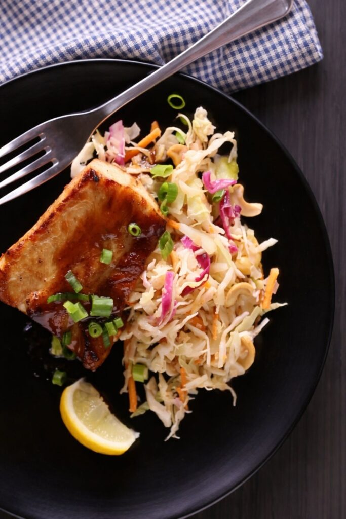 Sweet Smoke Broiled Fish with Sesame Cashew Slaw