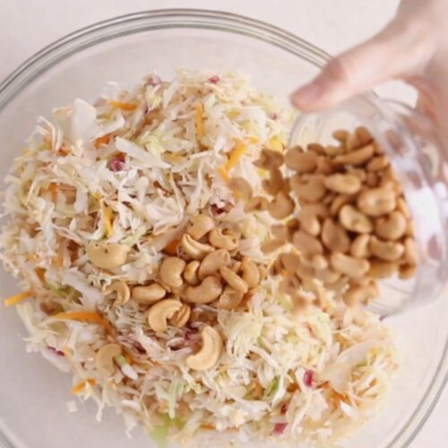Roasted peanuts, almonds, or even sunflower seeds will give you that crunchy contrast if cashews aren’t happening. If your nuts are unsalted, add a pinch of salt after tossing so the slaw doesn’t taste flat. Crunch is the whole personality here, so don’t skip it unless you enjoy sadness.